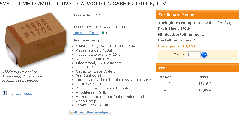 Lieferzeit auf Anfrage: allein das sagt schon aus das diese Tantalkondis keine gelagerte Ware sind dementsprechend teuer. Für gewöhnlich sind die natürlich billiger.
