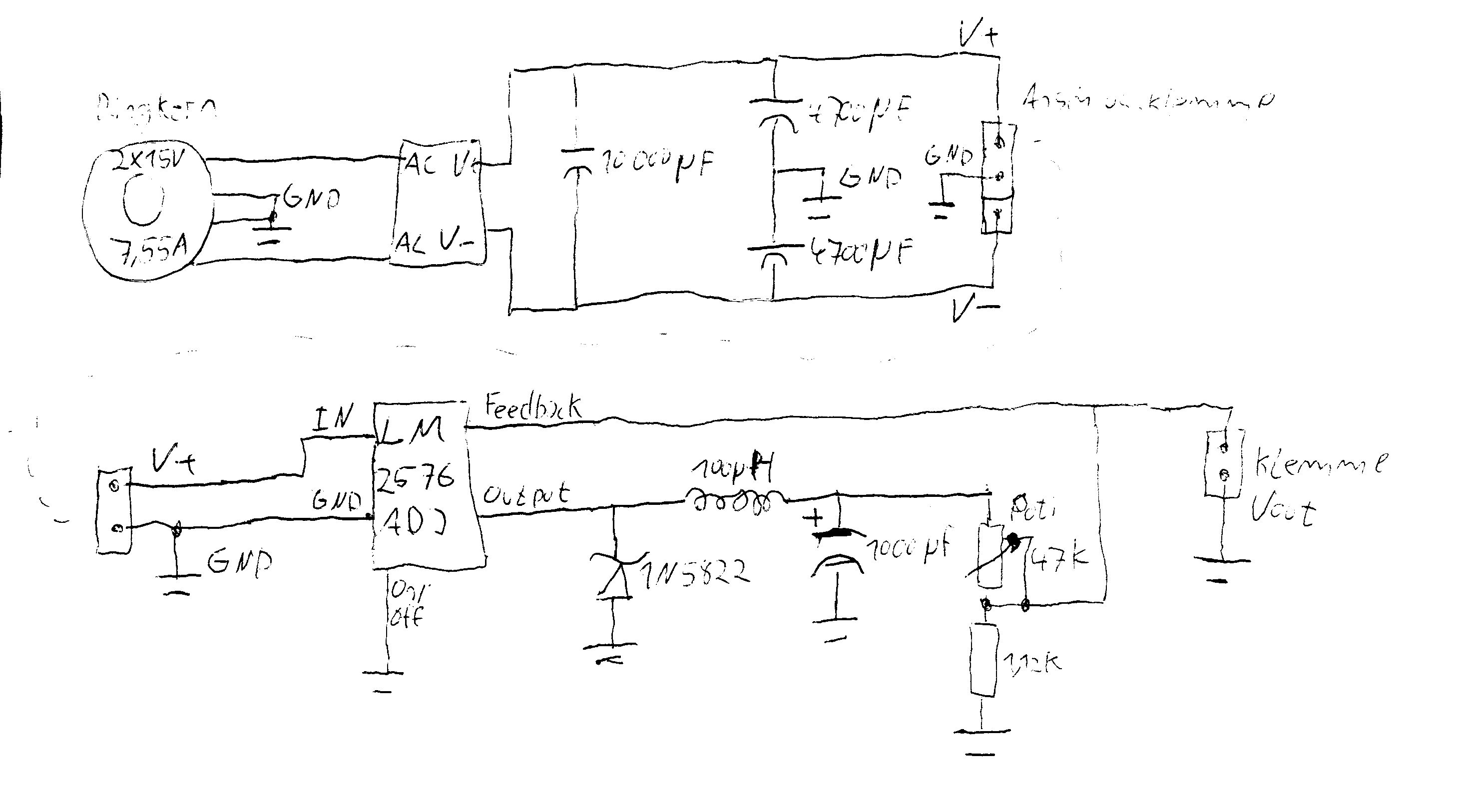 Hi Ich versuche gerade mir ein eigenes Schaltnetzteil mit dem Step Down Converter Lm2576 ( http://www.national.com/ds.cgi/LM/LM2576.pdf ) zu bauen. Klappt auf meiner selbstgeätzten Platine soweit auch ganz gut. Heißt die Spannungen kann ich korrekt einstellen und bei niedriger Stromentnahme (Lüfter mit 0.13 A) ist auch nichts zu höhren. Als ich aber zu Testzwecken mal eine Halogenbirnchen (12V 20W )angeschlossen habe fängt (ich glaube es ist die 100uH Drosselspule) die Schaltung an Geräusche zu machen. Das ganze fängt bei ca. 0.7A an und wird dann immer lauter. Das Geräusch ist schlecht zu beschreiben, hört sich in etwa so an als ob Wasser durch ein zu enges Rohr strömt.Sind auf jeden Fall nicht die 52khz Schaltfrequenz. Ich kann mal eine Aufnahme machen falls das weiterhilft. Und der Trafo fängt auch an zu brummen. Irgendwas fängt also an zu schwingen ich weiß nur nicht woran das liegt. Als Induktivität hab ich eine Standart Drosselspule von Reichelt genommen, vielleicht ist die nicht geeignet. Die Kondensatoren sind auch Standart Elkos von Reichelt. Ich weiß echt nicht woran das liegt sind doch nur ein paar Bauteile, oder ist das Schaltungsdesign so Kritisch. Sind aber schon große Masseflächen und breite kurze Leiterbahnen. Im Anhang hab ich mal meine Schaltung die ein bisschen vom Datenblatt abweicht. Die Eingangselkos sind um einges größer weil ich später noch andere Sachen (Schrittmotor) mit dem Ringkern betreiben will. Und eine Negative Spannung soll auch noch später erzeugt werden deshalb der Mittenabgriff am Trafo. Vielleicht hat ja einer ne Idee wo der Fehler ist.