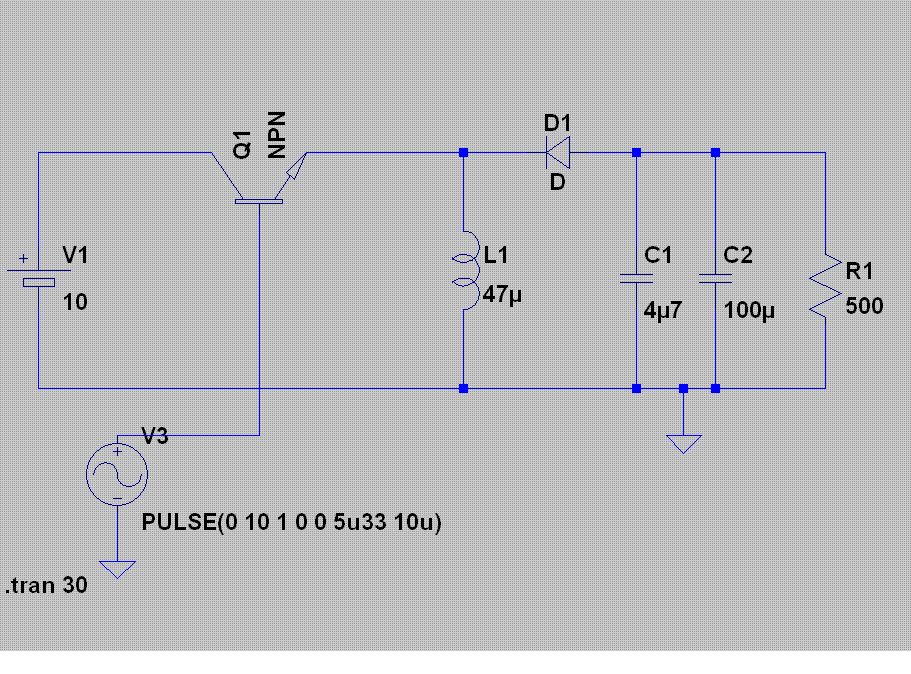 So sieht es dann fast fertig aus. Achtung, die Pulsweite muss man regeln, wenn man eine konstante Spannung haben will, da diese vom Laststrom abhängt. Die .asc Datei ist für LTspice.