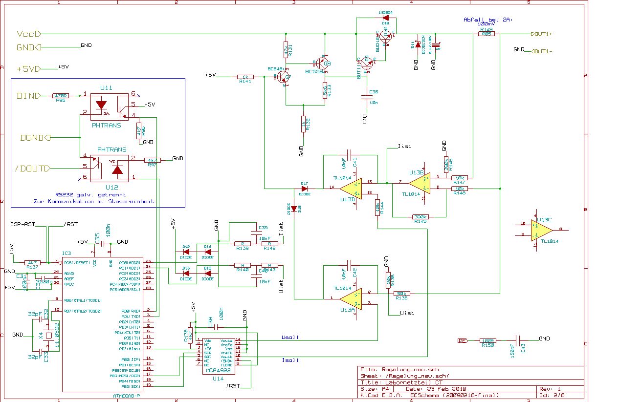 So, anbei mal die aktualisierte Version der Regelung. Als Vorlage dient(e) der Schaltplan von Ronny. Das R2R-Netzwerk ist weg, dafür wird nun ein MCP4922 (Dual D/A-Wandler) eingesetzt. Der ist günstig und vermutlich auch genau genug, vor allem aber ist das Ding garantiert monoton steigend. Die Strommessung habe ich nun auf die HighSide verpflanzt, die differentielle Messung von Ronny aber beibehalten. Der Differenzverstärker sollte eine Verstärkung von ca. x40 bringen um den Spannungsabfall am Shunt auf einen brauchbaren Bereich zu heben. Die Leistungstransistoren dienen momentan eher als Platzhalter, ich habe noch nicht entschieden welche Typen da rein müssen. So wie ich mir das vorstelle muss der Strom der über R141 in die Spannungsregelung geht (ca. 5mA) um den Faktor 400 verstärkt werden damit ich auf die 2A Ausgangsstrom komme, richtig? Ach ja, RC-Glied von GND nach PE ist nun auch drin, sollte eigentlich passen oder?