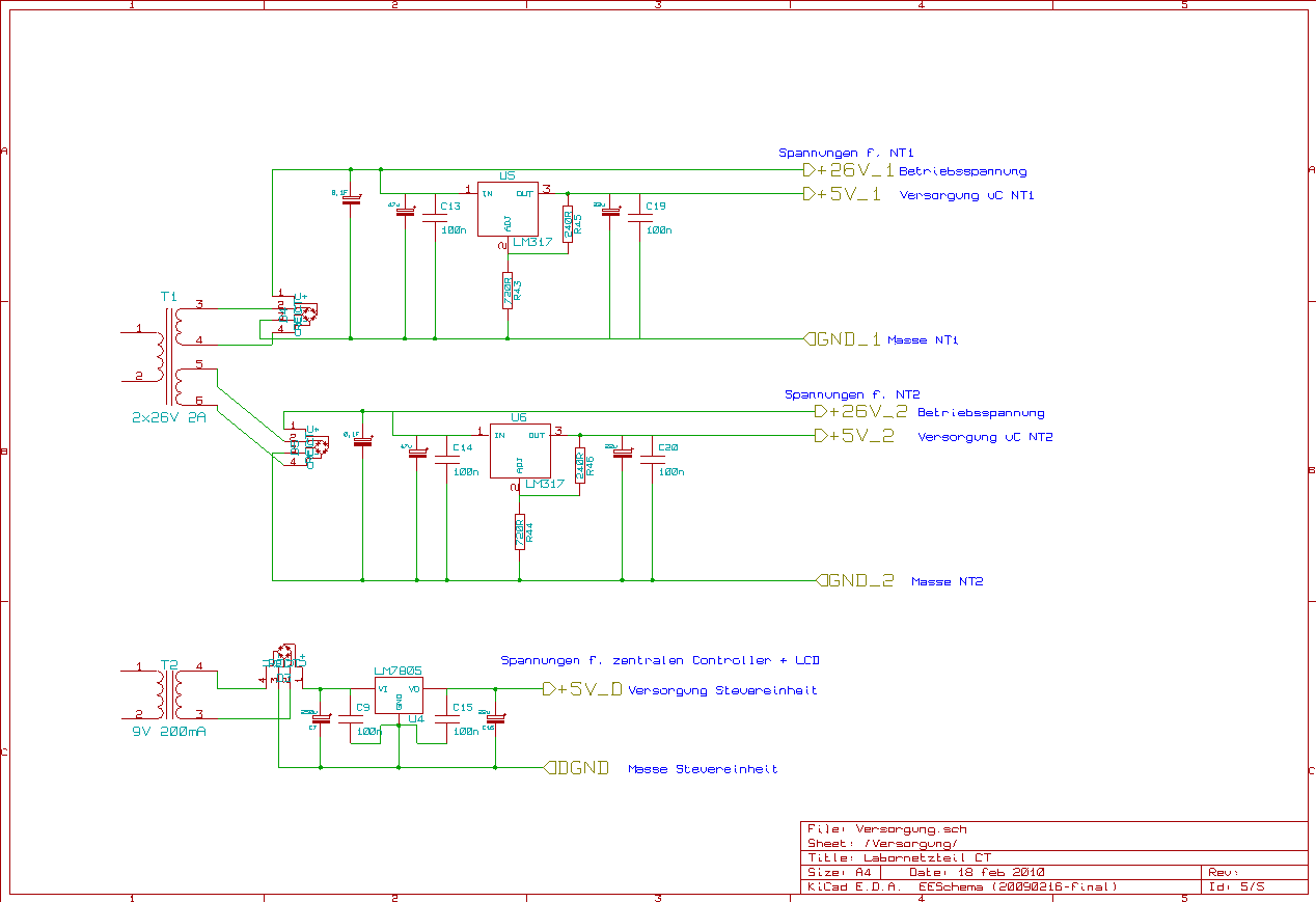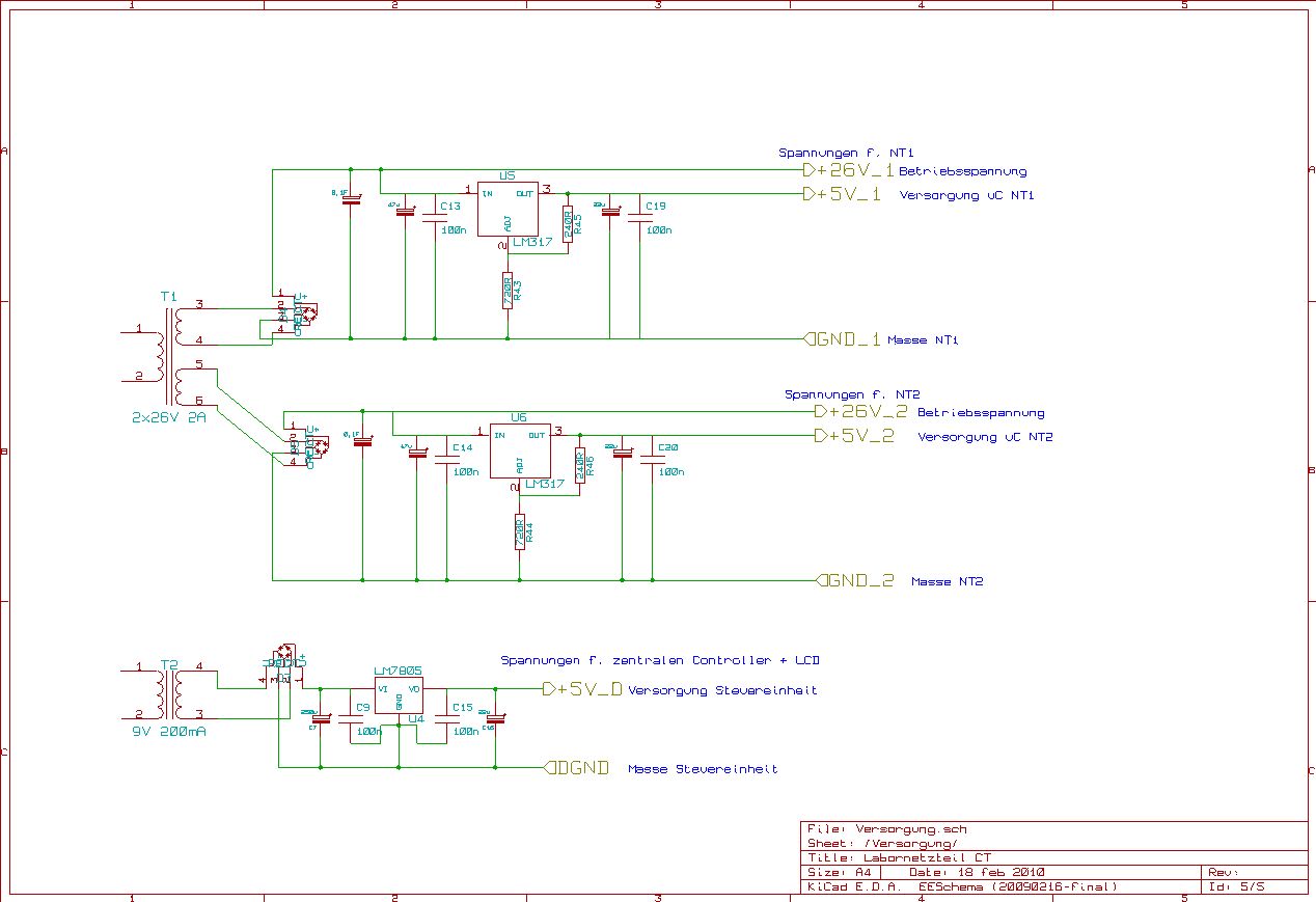 Hallo Forum! Ich plane momentan den Bau eines Labornetzteils und hoffe auf eure Mithilfe. Zunächst mal die geplanten Eckdaten/Anforderungen: - 2 Kanäle, je Kanal 24V@2A - Die Kanäle sollen unabhängig, parallel und in Reihe genutzt werden können. - Analoge Regelung von Spannung und max. Strom durch OpAmps - Digitale Steuerung d. Kanäle (µC) - Anzeige von Soll-/Ist-Werten auf LCD - evtl. weitere Spielereien wie Interface zum PC o.Ä. Ich habe mir die Regelschaltungen von verschiedenen Netzteilen angeschaut und versucht diese zu begreifen. Basierend auf diesen "Erkenntnissen" (oder evtl. auch völligen Fehlinterpretationen) habe ich mich an einer "eigenen" Regel- schaltung versucht und bitte euch um Kritik, Kommentare und Anregungen. Die Sollwerte werden in Form von Spannungen im Bereich 0-5V von einem µC pro Kanal erzeugt. D.h. auf jeder der Endstufenplatinen wird ein µC sitzen (Mega8) der sich um die Erzeugung der Steuerspannungen und die Messung der Ist-Werte mittels ADC kümmert. Diese Controller sollen von einem dritten Controller über isolierte RS232 (Optokoppler) angesteuert und abgefragt werden. Der dritte µC ist für Benutzereingaben (aka "Knöbbsche drügge") und die Ansteuerung des LCDs zuständig. Der Grund für die drei Controller liegt einfach in der galvanischen Trennung der einzelnen Kanäle. Soweit ich es verstanden habe müssen die Kanäle eines NTs galvanisch getrennt sein damit ich die Ausgangsstufen in Reihe schalten kann um eine höhere Spannung zu erzielen, ist das richtig? (Ob die Schaltung so wie ich sie momentan ausgelegt habe überhaupt dazu in der Lage ist wäre dann die nächste Frage, die stelle ich weiter unten nochmal... ;)) Noch eine kurze Beschreibung der Baugruppen, dann kommen die Fragen... ;) Versorgung: - Trafo mit 2x26V @ 4A bei 30% EZ Falls nicht muss halt noch ein größerer besorgt werden, aber den o.g. gab's für Umme aus der Grabbelkiste eines Freunds. Der Gute geht auch davon aus, dass der Trafo 2A Dauerstrom pro Wicklung schaffen sollte... - Hinter jeder Wicklung dann die Gleichrichtung und Siebung (10.000µF) - zusätzlich pro Kanal ein LM317 um die +5V für den µC zu generieren. - Die Steuerplatine (µC f. Benutzereingaben + LCD) wird von einem separaten Trafo mit 9V und nem LM317, 7805 oder so versorgt. Regelung: - Mega8 erzeugt Steuerspannungen 0-5V über R2R-Leitern. - Spannungen werden durch OA gepuffert, ggf. verstärkt und in die Regelung gegeben - Regelung besteht aus zwei OAs, als "Vorlage" diente mir das ELO-Netzteil Nr. 2 (http://www.elo-web.de/elo/grundlagen-und-ausbildung/operationsverstaerker/netzteil-mit-opv) - Mega8 liest IST-Werte per ADC ein und schickt sie an die Controllerplatine Steuerung: Noch kein Schaltplan gezeichnet, ist aber nix Wildes dabei. Es soll ein Mega162 verbaut werden da dieser bereits 2 UARTs in Hardware besitzt und somit die Kommunikation mit den beiden Endstufen komplett in Hardware abgefackelt werden kann. Abfragen von Tastern/Drehgebern und Ansteuern von nem HD44780 sind denke ich von der Schaltplanseite her uninteressant, daher hab ich den Teil erstmal hinten angestellt. Nun zu meinen Fragen: - Habe ich bei dem Konzept was Wichtiges vergessen? - Kann die Regelung so wie geplant funktionieren? - Was könnte (bzw. sollte) man da anders/besser machen? (Ich bin Neuling was OpAmps angeht, von daher sind mir vermutlich einige Fehler unterlaufen wie z.B. invertierender und nichtinvertierender Eingang vertauscht usw. . Wenn ihr also Vorschläge oder wichtige Hinweise habt dann erklärt mir bitte auch warum man es anders lösen soll/muss.) - Kann man die beiden Endstufen so wie das Netzteil momentan geplant ist wirklich in Reihe schalten? Parallel sollte kein Problem sein, aber Reihe erscheint mir kritisch. Falls es nicht geht, was muss geändert werden bzw. wie geht man an sowas ran? Und ja, mir ist durchaus klar dass man "brauchbare" "Labor"netzteile für unter 100€ kaufen kann, aber was ich so gelesen habe sieht es da mit der Qualität meist finster aus. Mir geht es bei diesem Projekt darum etwas zu lernen und am Besten hinterher mit einem selbstgebauten Netzteil dazustehen mit dem ich die nächsten Jahre zuverlässig basteln kann... Danke für's Durchlesen dieses doch recht langen Posts. Ich freue mich auf eure Kommentare. Grüße, Christian