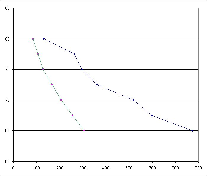 Hallo sepp Bist Du Dir sicher, daß in den Bedingungen das 0x stehen muß? Die grüne Kurve besteht aus Dezimalzahlen und die blaue aus Hexwerten. Die Dezimale macht irgendwie mehr Sinn. Ich mach mal mit diesen Werten weiter. 84, 106, 128, 168, 207, 256, 305 Wie es scheint, ist jeder zweite Wert linear interpoliert. Man könnte über eine Funktion direkt das richtige Ergebnis erhalten, ohne Tabelle. Dann hätte das Ergebnis 1% Auflösung (rel.Hum). Als Polynom 2.er Ordnung, (Fehler 0,5%): h = ((long)160*x*x/1000 - (long)1286*x/10 + 89380) / 1000; Als Gerade (Fehler 1,3%): h = (long)-63*x/1000 + 84 Mfg. Bernd