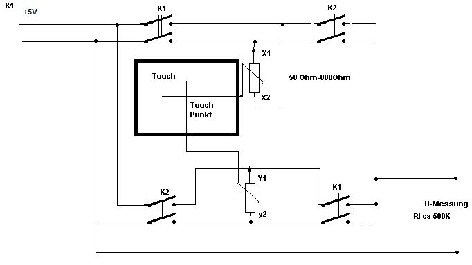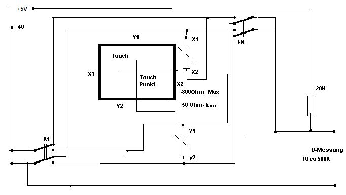 > wenn Du deine Schaltung noch nicht einmal selber verstehst. Ich habe hier eher den Verdacht, dass das Funktionsprinzip eines resistiven 4-Draht-Touch noch nicht richtig verstanden ist... So ein Touch hat 4 Anschlüsse: l, r, o, u Zwischen l und r ist eine lineare Widerstandsbahn auf einer Folie (top) und auf einer anderen Folie (bottom) ist zwischen o und u ebenfalls eine Widerstandsbahn. Diese beiden Folien werden übereinander montiert und mit Spacern auf Abstand gehalten. Zur Auswertung wird zwischen o und u eine Spannung (z.B. 5V) angelegt. Wird jetzt der Touch genau in der Mitte zwischen o und u betätigt, dann erscheint an den Anschlüssen l und r eine Spannung von 2,5V (ohne Belastung). Im nächsten Schritt wird zwischen r und l eine Spannung (z.B. 5V) angelegt. Wird jetzt der Touch z.B. an Position 2/3 von links betätigt, dann ergibt sich an den Anschlüssen o und u eine Spannung von 3,3V. Aus diesen beiden Messungen lässt sich jetzt die Betätigungsposition bestimmen. Siehe auch http://de.wikipedia.org/wiki/Touchscreen#Resistive_Touchscreens mit l = Ux1 r = Ux2 u = Uy3 o = Uy4