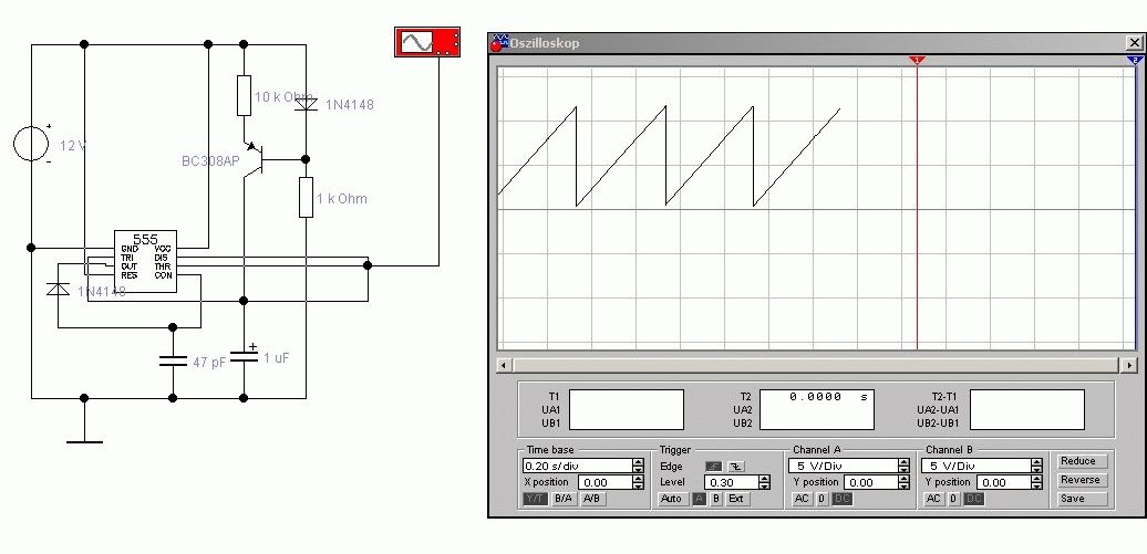 Hallo im Forum Wenn das Problem noch besteht, dann habe ich ein Lösung. Die Schaltung ist mit dem 555 zwar nur im Simulotor ausprobiert, macht aber einen linearen Sägezahn mit vollem Spaannungshub. Wie hoch belastbar kann ich nicht sagen. Außer 555 und übliche Bauteile nur ein PNP Transistor, Z-Diode und Diode zur Schnellentladung erforderlich. Gruß Freddy-F