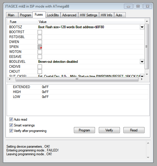 Hallo Leidensgenossen, ich habe eine neue Platine mit mega88 bestückt. Über Studio V4.18 wollte ich im SPIEN-Mode die Fuses setzen um dann anschließend im DWEN-Mode zu debuggen. Aber leider funktioniert erstmal garnichts. Es müsste doch zumindest das SPIEN-Häckchen gesetzt sein, oder? Siehe Anhang... Was mache ich falsch?