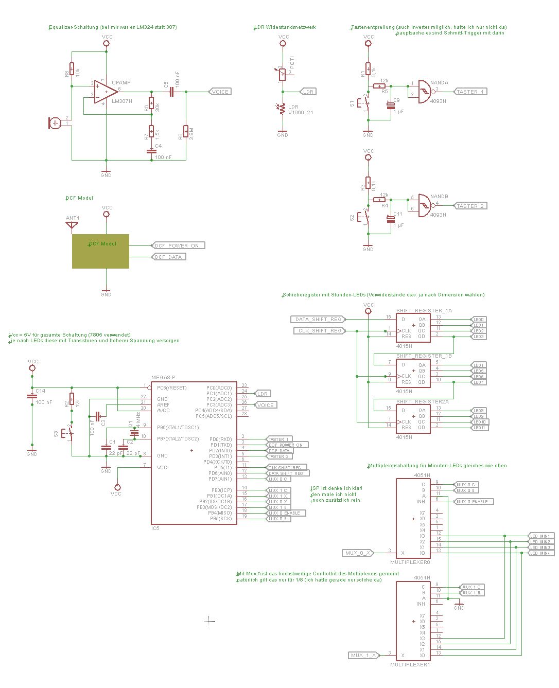 Danke! wobei die Uhrzeit die wirklich läuft schon sehr exakt berechnet wird (siehe die ganzen Registerwerte) aus dem Grund, dass die Uhr eben auch ohne Funk lange stabil laufen soll. Habe nun noch ein paar Fehler im Schaltplan entdeckt. Vor allem die Reset-Eingänge der Schieberegister...sind ja in dem Fall low-activ also Vcc mit GND ersetzen!!! Und die Ansteuerung der Multiplexer war so nicht ganz korrekt. Ich gehe jetzt davon aus, dass der X Eingang dem Enable Entspricht und die PWM Spannung selbstverständlich an den Eingang des Mux muss. Außerdem ist noch die Versorgung der Chips mit drauf...Hoffe das stimmt jetzt dann alles so. Grüße Flo