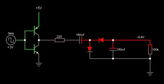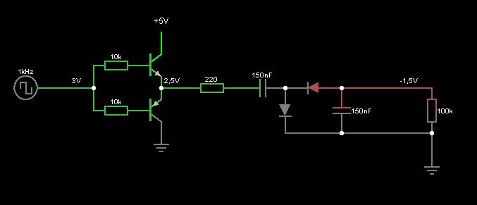ok, mein Fehler, habe die 3V am Eingang übersehen, weil am Port meistens um die 5V rauskommt. Wenn man nun der Schaltung von Jobst den komplementären Emitterfolger nachschaltet, kann auch der Kollektorwiderstand im Kiloohm-Bereich liegen und so an der Stelle Strom sparen. Jetzt noch für den Emitterfolger speziell niederohmige Transistoren einsetzen FMMT617 FMMT717 (Reichelt) und Schottky Dioden mit niedrigem Vf z.B. MBRS120 dann kommt die Ausgangsspannung nahe an -5V Ansonsten noch eine Stufe mehr kaskadieren.