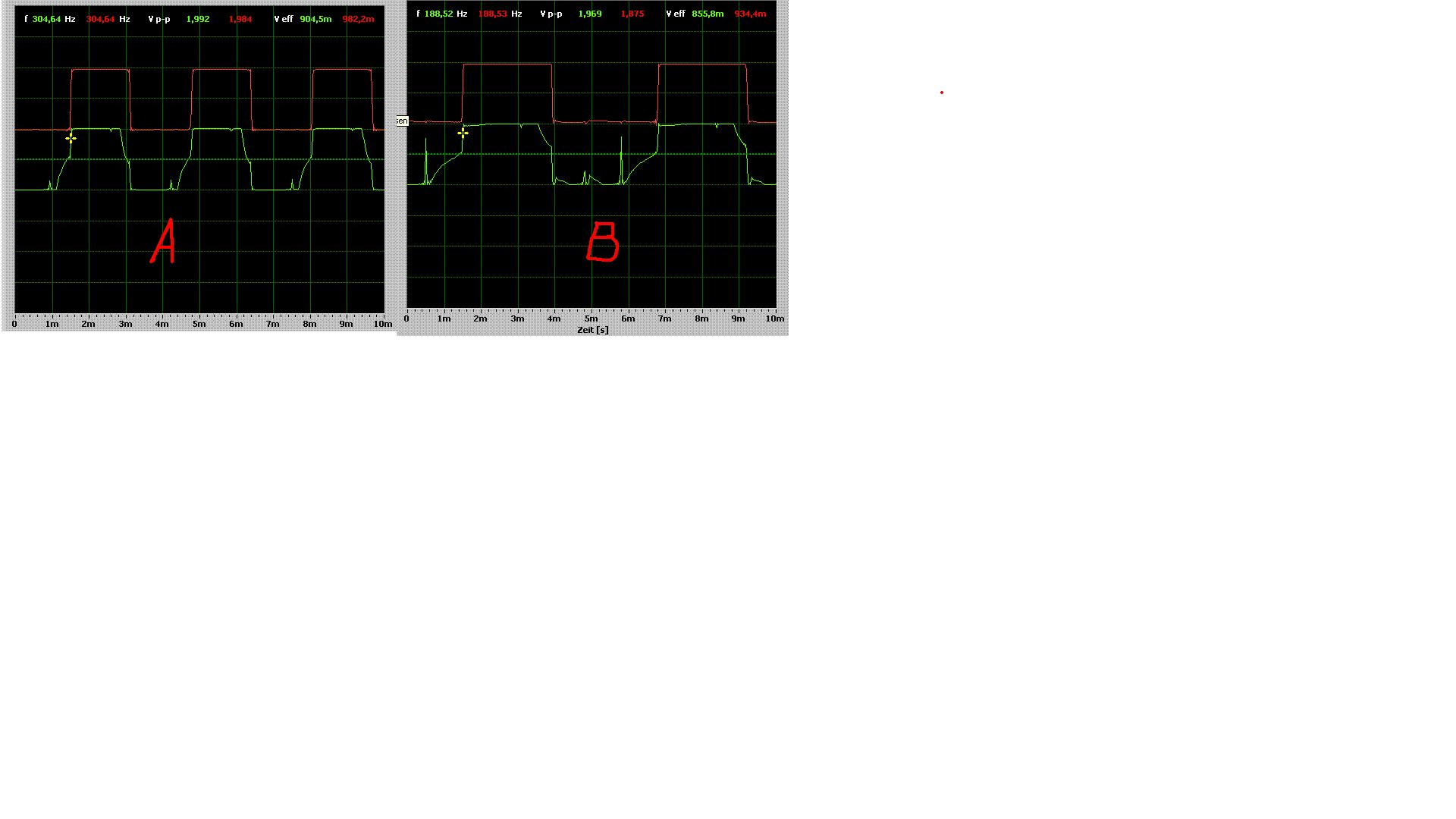 Guten Abend! Ich habe einen Sensorlosen kommutator für cdrom-Motor gebaut, ohne Mikrocontroller. Im Moment lässt es sich nicht steuern. Die 6 Eingänge der ganzer MOSFET Brücke werden je nach der 3 Comparatoren per Logik-Kommutator geöffnet, also direkt ohne PWM. In Paar Topics über BLDC Steuerung habe ich öfter gelesen das Ding ohne PWM werde mir über die Ohren Fliegen,es tut aber so nicht. High Side der Brücke besteht aus 3 P-MOSFET IRF 9z34n die werden per Transistor BC 847 geschaltet mit -5V soll er den Drain Strom von -4,5 A erreichen Die Low Side der BBrücke sind 3 N-MOSFET IRLZ24n (Logic) mit 4 V an Gate soll Drain Über 10A sein Der motor dreht sich gut,ganz weich und wakkelt sich nicht obwohl es keine 30 Grad Verzögerung zu jeder Kommutierung gibt.Dabei habe ich per soundcard OSci 2 Diagrammen dargestellt Diagramm A und B. Rot ist der Comparatorausgang und Grün ist die Spannung an der Phase Auf der ersten Diagramme(A) dreht sich der motor ohne Last.der Strom zwieschen Der Quelle und Der Brücke ist in disesem Fall 350 mA. Auf der zweiten(B) Diagramm mit einer Luftschraube (*PHOTO) frequenz ist auf 100 Hz gesunken und der Strom hier=600mA Als Quelle habe ich ein Netzteil mit 5V Spannung und 2 A max Strom auf dem Ausgang Der Motor hat 1,4 Ohm Widerstand je 2 Spulen Was soll ich tun, damit sich Motor mit Luftschraube schneller dreht MFG Dima
