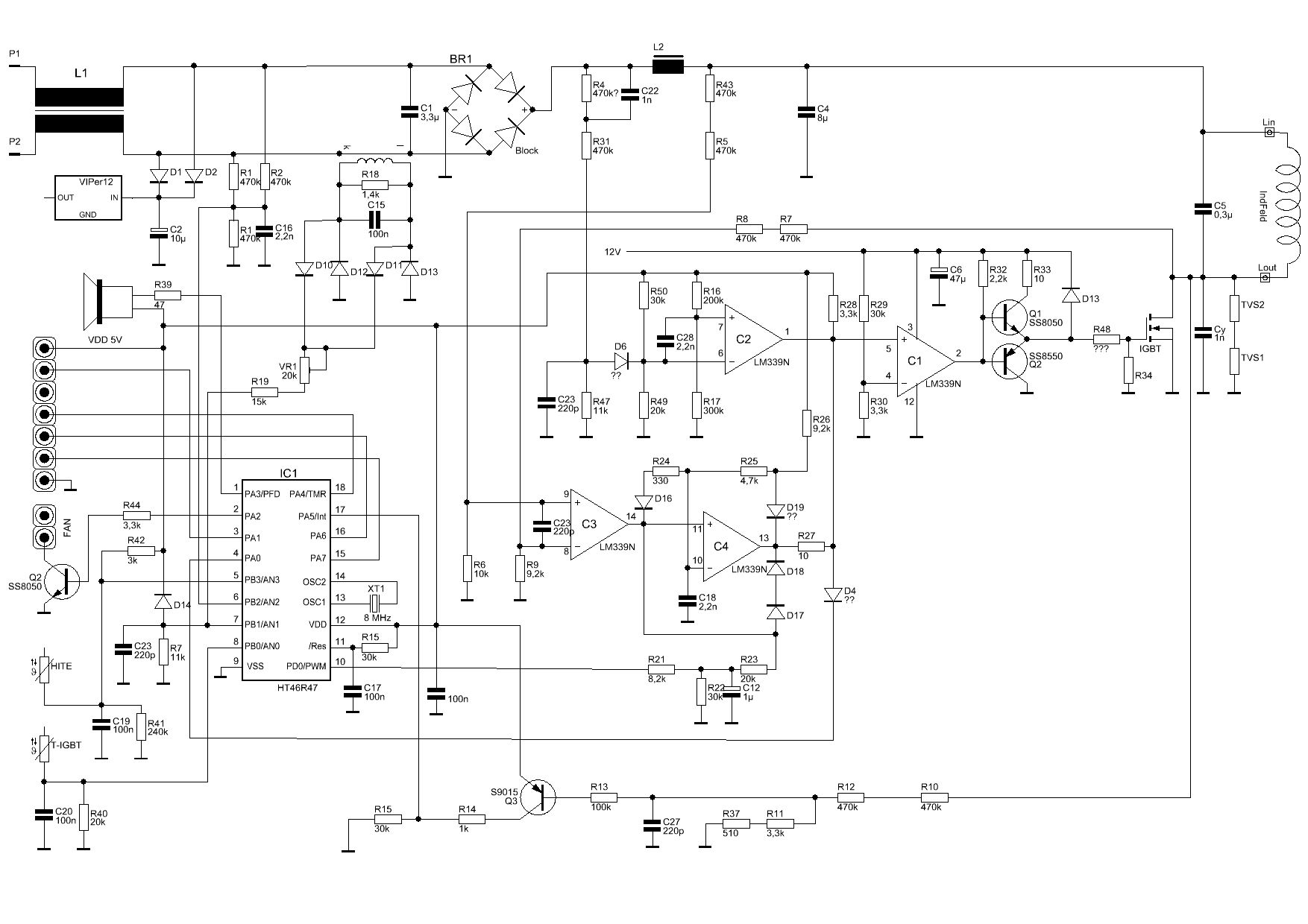Na ja, nette Schaltung, wohl von Konfusius persönlich. Zumindest die Beschaltung der vier Komparatoren. No1 steuert über zwei Transis den IGBT No2 sperrt No1 bei Überspannung (Netz) No3 vergleicht Eingangsspannung und Kollektorspannung vom IGBT No4 scheint als Generator zu arbeiten, hängt aber mit No3 und Pin10 vom MC zusammen. Pin4 vom MC kann den Eingang von No1 sperren. Der MC überwacht: - Temp. Kochfeld - Temp. IGBT - Primärstrom (Stromwandler) - Kollektorspannung des IGBT - Netzspannung Lüfter und Piepser werden direkt vom MC gesteuert. Und das Bedienfeld natürlich (vier Signale). Mal sehen, was ich ohne Spule messen kann. Wahrscheinlich nicht viel. Das Innenleben meines Gerätes sieht etwas anders aus. Kein Netztrafo, anderer MC ... Lothar