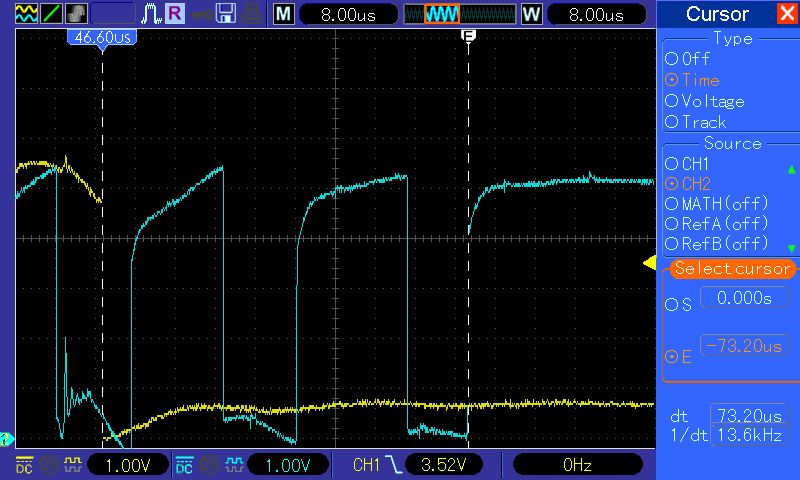 Denke ich hab's verstanden. Die Methode Pin 1 auf Eingang, PWM aus und Pin 8 auf LOW nageln stoppt den Resonator zuverlässig. Instant On geht ohne PWM natürlich nicht mehr. Da wird etwas Wartezeit nötig sein, bevor ich den Startimpuls absetzen kann. Werde den Code mal entsprechend umbauen. Aus den angehängten Bildern könnt ihr sicher schon erahnen, wie die Topferkennung funktioniert. Das gelbe Signal dort ist nur ein Triggerimpuls, den ich mir zum Auschaltzeitpunkt am Pin 10 ausgeben hab lassen.