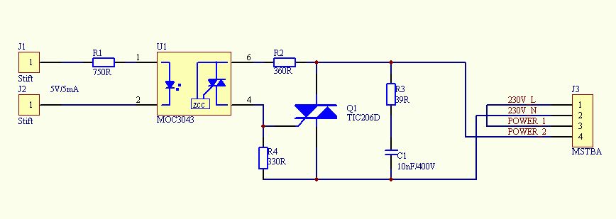 Du könntest auch das Solid-State Relais S202-T02 von Sharp verwenden. Dieses SS-Relais hat einen Nullspannungs Detektor integriert und kann wie eine LED, meist direkt vom MCU angesteuert werden. (interne LED ~10mA/1.1Volt). Vorteil: nur 2 Bauteile erforderlich S202-T02 + 390Ohm Widerstand (bei 5Volt) Du kannst dieses Teil es bei www.ribu.at für 3,26 (bei 10 Stück) bestellen.