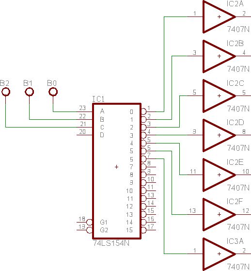 Der entscheidende Teil ist im angehängten Bild zu sehen. Ist eigentlich nichts. Angesteuert wird der 74LS154 extern von einer DAQ-Karte von National Instruments. Die 7407 treiben Relais. Versorgung über eine stabiliesierte 5V. Danke, Gruss Michael