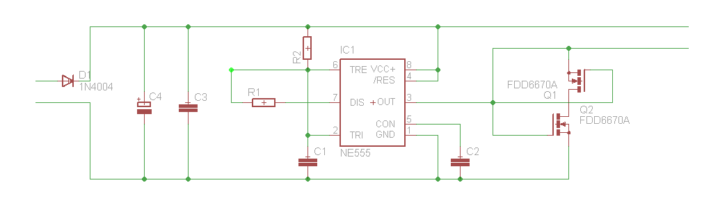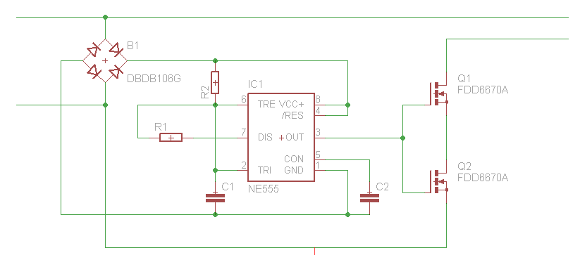 Das geht so nicht. Einen FET umdrehen, an den Source-Beinchen zusammenschalten. GND vom 555 muss auch an die Source-Beinchen. Damit geht aber die Spannugsversorgung nicht mehr einfach mit nem Brückengleichrichter...