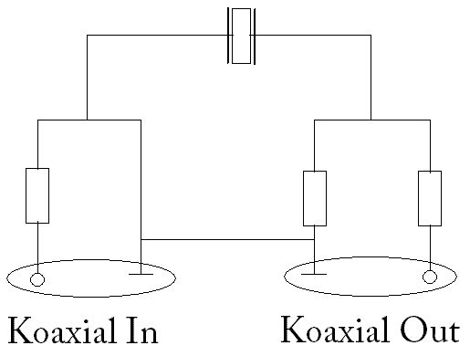 Das kann nicht funktionieren, denn du schliesst dein Eingangssignal am koax-input nach Masse kurz und dein Quarz liegt dort auf Massepotential. Der Eingangssinus wird im Widerstand am Eingang verbraten.