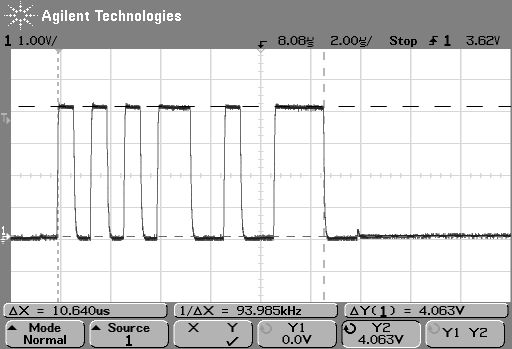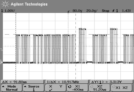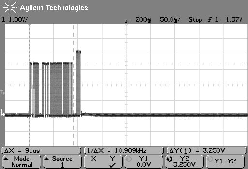 Hallo! Ich hoffe das mir noch jemand helfen kann! Vorgeschichte: ich habe das Irmp von Frank M. http://www.mikrocontroller.net/articles/IRMP mit V-USB http://www.obdev.at/products/vusb/index.html kombiniert. Sinn der Sache ist, dass empfangen Codes per USB an den Host übertragen werden. Die Übertragung geht per Polling vom Host über HID Device: http://msdn.microsoft.com/en-us/library/ms790913.aspx Auf dem PC, wo ich es programiert und getestet hatte ging das Polling und empfangen von Codes einwandfrei. Dann bin ich mit dem Empfänger zu einem anderen PC gegangen und siehe da, dass Init geht nicht. Dies hab ich behoben, das ich zuerst Timer0 starte und nach ~4s der Timer1 gestartet wird, der die IR-Codes empfängt. Dann geht das Init, jedoch gibt es weiterhin probleme mit dem Polling. INT0: Wird für USB verwendet INT1: Polling Timer für IR-Erkennung Anbei habe ich einmal mit dem Oszi gemessen am D-: (Die höheren Spannungen ist die Antwort vom AVR) OK_Port: so schaut es an dem PC aus wo es keine Probleme gibt. Reply_of_AVR: So schaut die Antwort des AVRs aus, jedoch nicht 4V wie im Bild sondern 3,6V (Z-Diode) NOK_Port_1.gif: Wenn das Polling klappt sieht es so auf dem Port aus an dem es die Fehler gibt. NOK_Port_No_Reply_of_AVR: hier sieht man, dass der AVR gar nicht antwortet NOK_Port_No_Reply_of_AVR_2: hier nocheinmal NOK_Port_No_Reply_of_AVR_3: und hier nocheinmal Wie gesagt beim "guten" Port sieht es immer so aus wie bei OK_Port.gif. Bei Ports die Probleme machen so wie die anderen Gifs. Getestet auf: P35-DS4 Gigabyte, Win7 32: Alle Ports OK MA785GM Gigabyte, Win7 32: Es gibt bei jedem Port gibt es Probleme, egal ob intern oder externe Ports. X40-Laptop+Dockingstation, WinXP SP3: Ports am Laptop gehen, Ports auf der Dockingstation gehen nicht. Gerade wegen dem x40-Laptop tippe ich auf vielleicht ein Spannungsproblem von D+ oder D-. Es scheint ja USB-Chips geben die sehr empfindlich sind. Mein Atmega8-16 läuft leider nur mit min. 4.5V. Eine Alternative wäre der Atmega8-8. Der läuft auch mit 3.3V, jedoch weis ich nicht ob ich den auch mit 12Mhz betreiben kann. Das Datenblatt sagt 8MHz. Auch habe ich den Atmega Source hier einmal drangehängt. Die Software vom Host kann ich auch noch zur Verfügung stellen. Der Source ist nicht ganz sauber, da ich schon viel herum probiert habe... Ich hoffe, dass mir jemand noch den Entscheidenen Tipp geben kann, damit das endlich auf alle USB-Ports funktioniert. Danke!