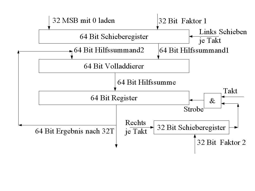 Sorry, habe mich vertan. Brauche naturlich 32 Zyklen. Kann sein, dass das nun nix mehr ist. Siehe Bild. Das funktioniert wie beim Schriftlichen Multiplizieren. Achso Latch ist Falsch, Register natürlich. 1. Register löschen. Schieberegister 1 und 2 Laden 2-33. wenn das LSB von Faktor 2 1 ist wird die Summe aus Vorergebnis und Faktor 1 ins Register geschrieben, bei O bleibt der Alte Wert. Dann werden beide Register verschoben und der Vorgang wiederholt, solange bis Faktor 2 durchgeschoben wurde. Dann kann man das Ergebnis lesen.