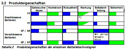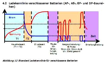 der neue Stand der Dinge: Die beiden Batterien werden abgeholt, weil der Händler diese AGM-Ausführung für Traktion für zu wenig geeignet hält und zudem meint das Ladegerät würde nicht dazu passen. Angeblich sei nur eine GV 12050V geeignet. Die "Deta Drivemobil 12V DTP 60F", die 8 Jahre durchgehalten hatte gibt es nicht mehr. Leider haben nur sehr wenige Hersteller brauchbare Datenblätter, wo man sehen kann wie es mit der Temperaturabhängigkeit der Ladekennlinie und mit der Zyklenfestigkeit steht. Der 8A-Lader ist laut Aufdruck sowohl für GEL und SLA (sealed lead acid) geeignet. Zur Ladekennlinie und deren Temperaturabhängigkeit ist nichts angegeben Matthias