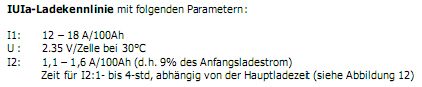 Leider schaut es so aus, als ob echtes ! Wissen heute eher rar ist. Anbei eine temperaturabhängige Ladekennlinie für Gel. Bei niedrigeren Temperaturen muss die Spannung angehoben werden. Es macht wohl keinen Sinn wenn bei 2 Batterien in Serie die eine Batterie 1V mehr sieht als die andere. Die Unterschiede müssen klein sein, sonst gast die eine und die andere wird nicht voll. Natürlich sind Gel- und Flüssig-Blei-Akkus unterschiedlich zu laden. Flüssig-Blei kommt daher ja in diesem Fall nicht in Frage. Also gibt es nur noch die Gel- und die AGM-Varianten. Diese scheinen laut dem Bild aus dem "Produkthandbuch Blockbatterien" Version: 2005-LA von Exide-Technologies Seite 20 vom Ladeverfahren her gleich. accu-24.de/PDF/exide-handbuch-blockbatterien.pdf Dazu passt auch die Info aus Seite 21 über Vlies- und Gel-Batterien. Siehe Bild IUIa-Ladekennlinie. AGM (Vlies) scheint eher als Starterbatterie gut. Die Lebensdauer für Traktion ist da wohl nicht so toll. Nach 200 Zyklen tieferer Entladung ist da Schluß. Spezielle Gel-Batterien für Traktion sollen da besser sein. Kennlinien sind schwer zu finden. Durch die Fusion von Batterieherstellern verschwand die alte Deta aus dem Programm. Am robustesten sind wohl FT-Batterien. Seite 10. Die Traktionstypen FT entladen sich viel rascher als die GF-Typen. Wer will schon das ganze Jahr den Lader hängen lassen? Nachladeintervall FT 3 Monate und GF 12 Monate. Welcher Händler weiß dies und weist beim Kauf darauf hin? Ich bekam leider falsche Aussagen präsentiert und als ich genauer nachfragte warf man rasch das Handtuch. Als Kunde erwarte ich da mehr belastbares Wissen. Matthias