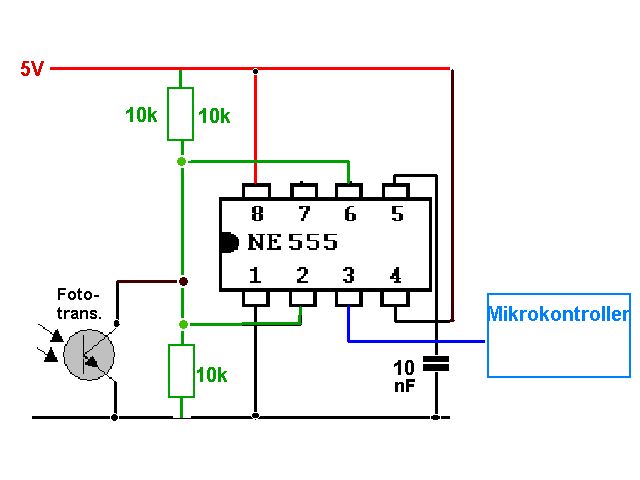 Hi, ich habe eine Frage wegen der Geschwindigkeit beim Drehzahlmessen. Eine Scheibe (5cm) mit einem Loch ziemlich am Rand steckt auf einer Motorwelle. Durch das Loch kommt Licht auf den Fototransistor und das soll jedes Mal ein high Signal an den Mikrokontroller geben. Damit das ein sauberes Signal ist, schalte ich einen Schmitt-trigger dazwischen. Jetzt meine Frage: Ist der NE555 dafür gut? Schaltet der wie im Bild so schnell, dass ich so ungefähr bis 300 U/Min. messen kann oder brauche ich da einen anderen/besseren Schmitt trigger? lg Triti