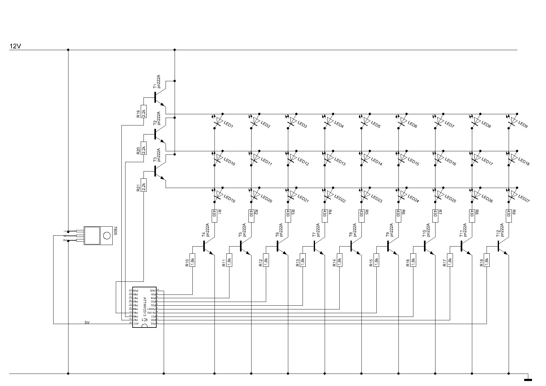 Vielen Dank muss ich sagen :) Der Atmel läuft jetzt super. Ich habe den PA2 als Reset gelassen und mit dem internen pull-up Widerstand auf 5 volt gelegt. Hinter den Spannungsregler an die 5 Volt musste noch ein kondensator da sonst, wenn alle LED's an waren der Reset wieder low erkannt hat. Aber jetzt läuft es erst mal. Das mit den Transistoren werde ich mir nochmal angucken. Muss auch dazu sagen war das erste mal das ich mit Transistoren gearbeitet habe. Und sie haben auch nicht die von mir erwartete Ausgangsspannung von 12 Volt. Wenn alles funktioniert werde ich die Schaltung und ein kleines Testprogramm nochmal reinstellen damit sich Interessenten den LED-Cube nachbauen können. Vielen Dank an dich Stefan B.
