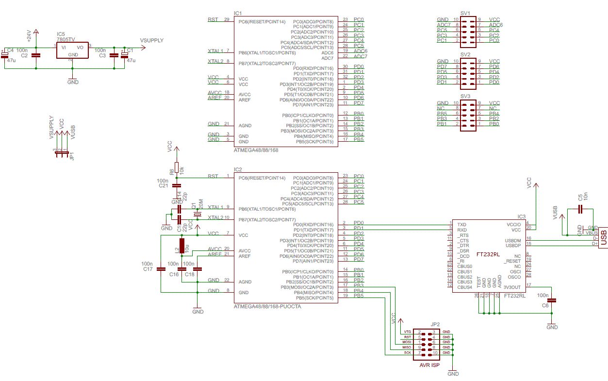 Für AVR ISP würde ich die 6-polige Ausführung bevorzugen und zweckmäßigerweise auch /Reset anschließen. PB6 und PB7 sollten auch nach außen geführt werden, wenn der interne Oszillator verwendet wird. Den Betrieb mit einem Uhrenquarz würde ich auch vorsehen. An Stelle des USB Teils würde ich einen MAX232 mit RS232 Anschlüssen bevorzugen. Die dabei erzeugte V- kann für externe OPVs dienlich sein. Den 7805 würde ich durch einen LP2950-5 ersetzen, damit der Stromverbrauch des Reglers nicht höher als der der Schaltung ist. Aber vor allem würde ich