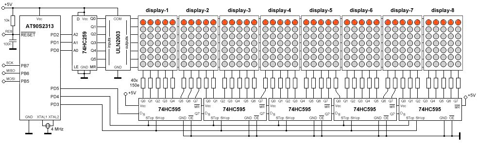 Ja, das ist doch nen PNP Array oder? für die Spalten würde ich keine Transistor Arrays nehmen. Hier brauchst du Transistoren, die im max. Fall ja den 25 fachen Strom (natürlich 1/25 Pulsverhältnis) für 8 LED's aushalten müssen. Für die Selektierung der Spalten haben wir bei der 256 * 8 Laufschrift für jedes Modul zwei 4Bit hexadezimal Decoder (4 Eingänge -> 16 Ausgänge) gewählt. Aber mit nem Dezimalzähler (4017) oder Schieberegistern ist es nicht viel anders.