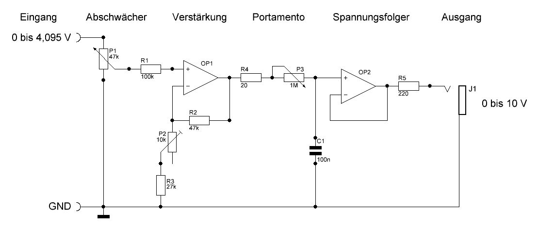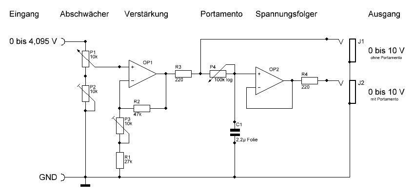 Hi! @Koch: ein externer Synthesizer (hier: MFB Kraftzwerg) soll durch verschiedene Spannungspegel gesteuert werden. @Kai Klaas: vielen Dank für Deine Tipps. Ich habe die Schaltung noch etwas angepasst und getestet (bis auf Portamento). Den Widerstand nach dem Abschwächer-Poti habe ich weggelassen, da der NonInv-Eingang sowieso hochohmig ist. Zusätzlich habe ich noch einen Trimmer vorgesehen, um den Regelbereich einzuschränken. Bis jetzt funktioniert alles. Wenn noch jemand einen Tipp oder Bedenken hat, bitte melden. Dank im Voraus und Gruß von Tom.