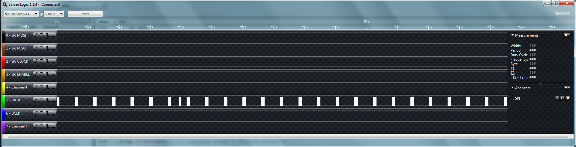 Hallo Charly, ich habe jetzt die Initialisierung aus Deinem Projekt verwendet. Nur die Initialisierung um zu sehen was am RFM12 rauskommt. Im Anhang ein Mitschnitt vom LA, ohne das hier irgendetwas sendet. Ich vermute mal das das was ich da sehe das Rauschen ist. Habe ich noch eine Möglichkeit das weiter zu filtern ? Wie hast du den DATA und DCLK Pin verdrahtet ?