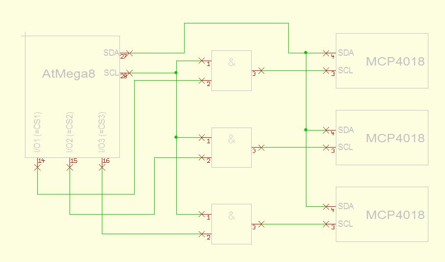 Hallo zusammen, bisher habe ich bei meinen AVR-Projekten I²C (bzw. halt TWI) immer das "Glück" gehabt, dass die Slave-Bausteine (LED-Treiber, EEPROM,...) einstellbare Adressen hatten. Jetzt kenne ich 3 Möglichkeiten, die alle verständlich sind: 1) Adresse kann mit mehreren (z.B. 3) herausgeführten Pins eingestellt werden 2) Adresse kann mit 1 Pin (über analoge Spannung) eingestellt werden (z.B. SAA1064) 3) Adresse ist fix, aber es gibt verschiedene Varianten (mit unterschiedlichen Bestellnummern) Was mache ich aber, wenn ich mit einem Mega8 mehrere (hier 3) Bausteine ansprechen muss, bei denen nur eine Adresse ausgeliefert wird und die zudem auch nicht verändert werden kann? Es handelt sich hierbei um die Bausteine "MCP4018" von microchip. Das sind digitale Potis mit 100kOhm und 6 Pins (siehe Device.gif). Die Spec (zu finden unter http://ww1.microchip.com/downloads/en/DeviceDoc/22147a.pdf) habe ich nicht mit angehängt, da 3MB groß; aber der wichtige Teil steht auf Seite 36 und das habe ich mal als "AddrInfo.gif" angehängt. Die blöden Dinger haben alle die gleiche Adresse :-( Zuerst dachte ich mir: Kein Problem, hänge ich die ganzen Clock-Eingänge der Potis an die Ausgänge von UND-Gattern und die Eingänge beschalte ich so, wie im Anhang beschrieben (siehe "KeineGuteIdee.gif) Ich glaube, dass es bei dieser "Lösung" nur bedingt funktionieren würde, weil - Kann der Slave über "Festhalten einer Leitung (SCL(?)) nicht dem Master mitteilen, dass er zu schnell ist? Das ginge dann so nämlich nicht mehr. Aber wie macht man sowas jetzt wirklich? Das müsste doch fast sowas wie ein Standardproblem sein, oder? Wie immer würde ich mich über ernstgemeinte Hilfe freuen :-) Vielen Dank und viele Grüße, Michael