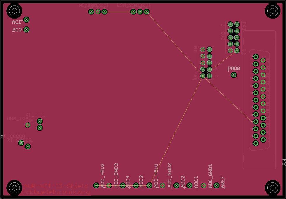 Hallo! um das Pollin AVR-NET-IO zu erweitern, habe ich mir überlegt, so etwas wie die Shields für Arduinos zu bauen. Das Board ist so gedacht, dass man auf dem NET-IO statt der liegenden SubD25-Buchse eine stehende anbringt und auf dem Shield das Gegenstück. Leider sind die Standard-Buchsenleisten zu kurz, um direkt mit den mitgelieferten Pinheader auf dem Board zu verbinden (wegen SubD-Stecker + Buchse). Folgende Anschlüsse werden herausgeführt: - Klemmen des Stromanschlusses (bei ausgelöteten Dioden) - Anschlüsse der Spannungsregler (wenn sie ausgelötet sind) - Prog-Pin - ISP-Anschluss - EXT-Anschluss - Sub-D-Stecker des Boards - Analog-Eingänge - UART TTL (bei ausgelötetem Pegelwandler) - UART RS232 Wenn ich es richtig sehe, werden alle Portpins außer PB2 und PB4 herausgeführt. Die Positionen der Buchsen und Pins habe ich aus der PDF-Anleitung des Bausatzes nach bestem Wissen und Gewissen "Reverse-Engineered", kann aber noch keine Garantie über vollständige Korrektheit geben. Ich wäre dankbar, wenn jemand das Board kurz ausdruckt und es mit einer unbestückten Platine im Gegenlicht prüfen würde. Mit der bestückten kann ich es nicht genau nachvollziehen. Viele Grüße