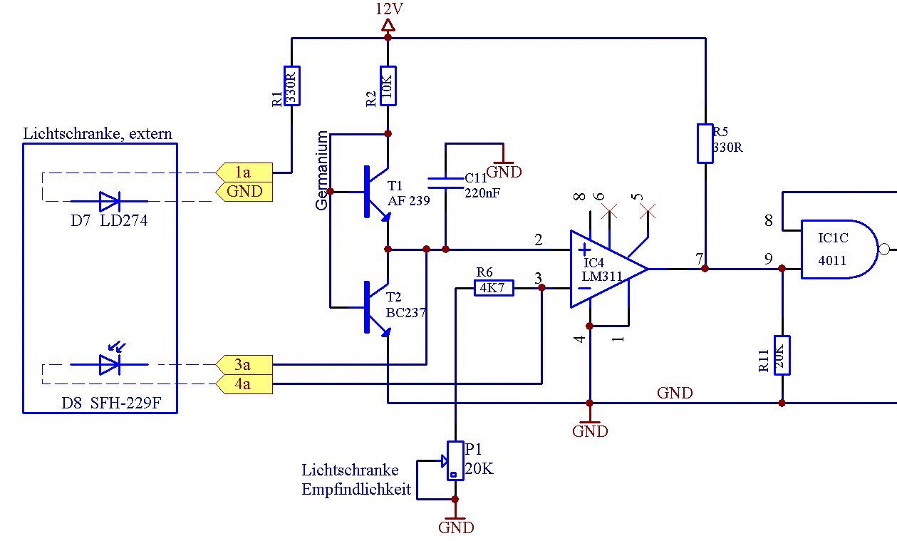Die Schaltung ist ein Ausschnitt und zuständig dafür, das Signal einer Lichtschranke (links) weiter zu geben - Licht unterbrochen oder nicht, also ein JA-NEIN-Signal. Wie schnell?