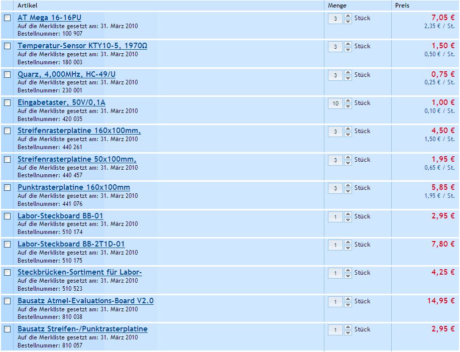Nimm einen 16Mhz Quarz und lass den Temperatursensor weg. Kannst dafür bei maxim einen digitalen als sample holen. Punktraster finde ich persönlich auch eher unpassend. Da muss man so viele Kabel ziehen^^ Anstatt dem Steckbrückensortiment kannst auch einfach im Baumarkt 1m Netzwerkkabel kaufen. Da hast du ordentlich viele Kabel drin (aufpassen, keine Litze), die du als Brücken nehmen kannst. Mache ich schon seit Jahren so. Warum 2x Lobor-Steckboard? Reicht dir nicht eins.