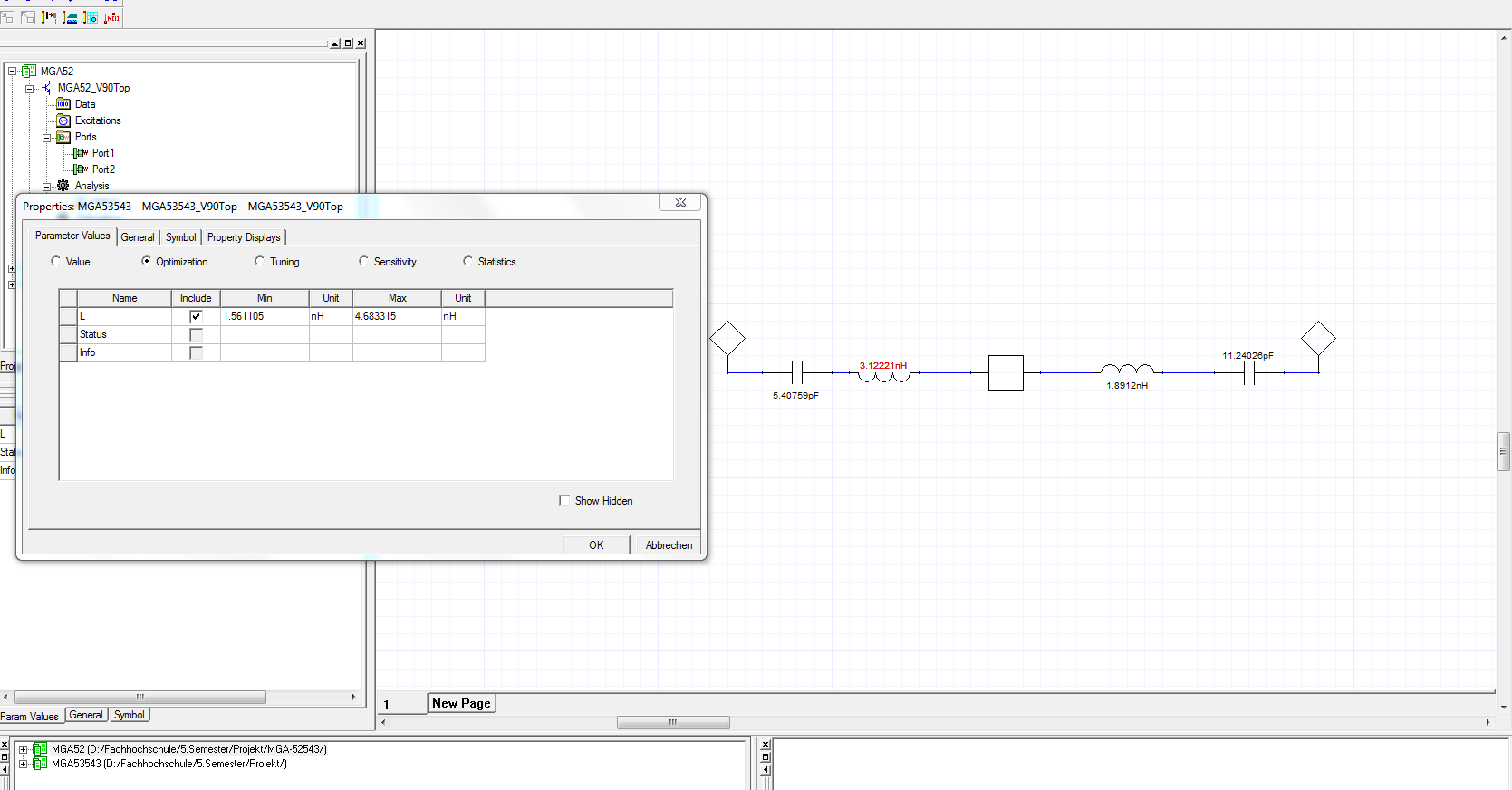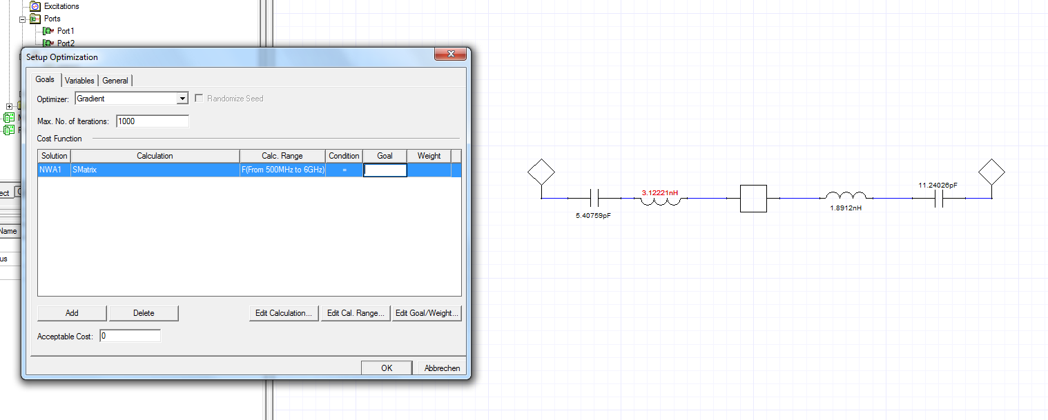 Hallo liebe leute, ich habe eine Frage zu dem Simulations Programm "Ansoft Designer", ehmals Serenade. Ich möchte eine Anpassschaltung optimieren. S11,S22 und S21 soll minimal, bzw. maximal sein. Bei Serenade (studentenversion) ging das ja recht leich mit dem Optimierunggsblock. Dort konnte man dann z.B "S11 -20dB" eingeben. Im Designer tool sieht es nun wie folgt aus: In Bild 1 gebe ich die Induktivitär zur Optimierung frei. In Bild 2 frage ich mich jetzt, wie ich z.B. nach S11 optimieren, bzw. was in Goal/weight reinkommen muss, damit er S11 optimiert. Evtl kann mir da jemand nen Tip geben, müsste ja an sich ähnlich sein, wie in Serenade. besten Gruß Nick