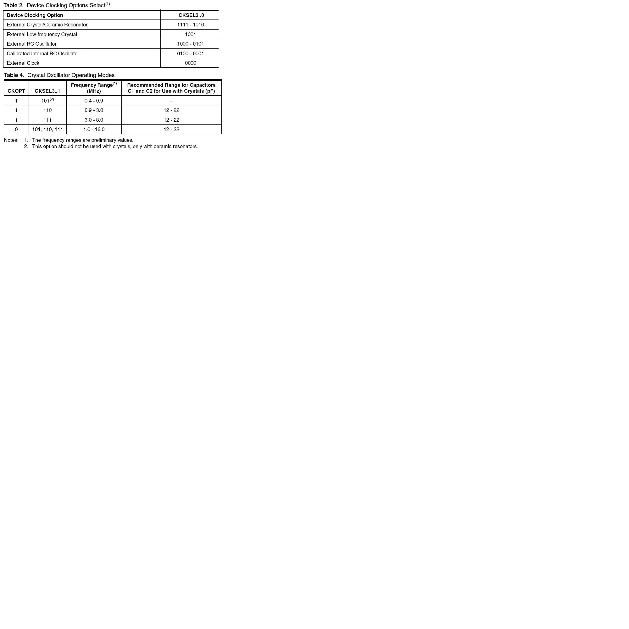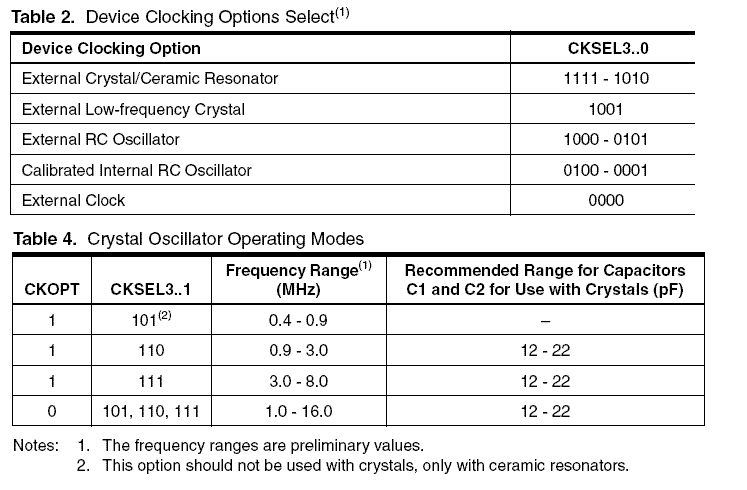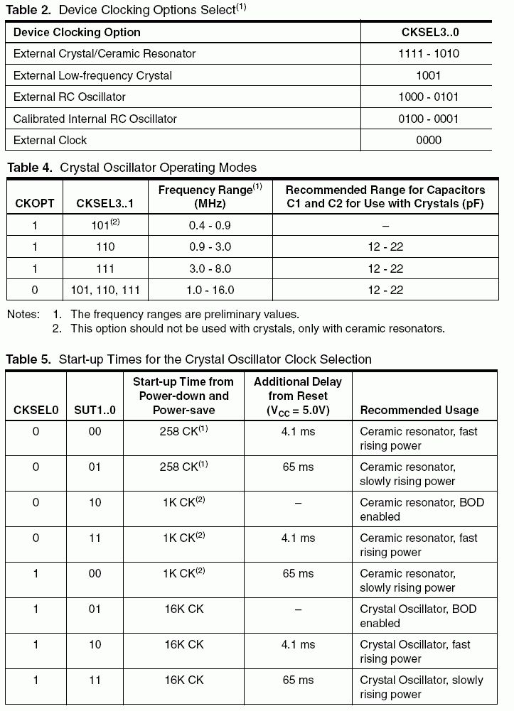 Hallo, also hier ist ein Auszug. Damit sollte eigentlich alles klar werden. Das Studio gibt es übrigens kostenlos unter www.atmel.com. Am besten mal die Werte mit dem Datenblatt vergleichen, dann kommt man ganz einfach dahinter was man brauch. Ext. Low Freq. Crystal; Startup Time 1K CK + 4ms [CKSEL=1001 SUT=00] Ext. Low Freq. Crystal; Startup Time 1K CK + 64ms [CKSEL=1001 SUT=01] Ext. Low Freq. Crystal; Startup Time 32K CK + 64ms [CKSEL=1001 SUT=10] Ext. Crystal/Resonator Low Freq; Start-up Time 258 CK + 4ms [CKSEL=1010 SUT=00] Ext. Crystal/Resonator Low Freq; Start-up Time 258 CK + 64ms [CKSEL=1010 SUT=01] Ext. Crystal/Resonator Low Freq; Start-up Time 1K CK + 0ms [CKSEL=1010 SUT=10] Ext. Crystal/Resonator Low Freq; Start-up Time 1K CK + 4ms [CKSEL=1010 SUT=11] Ext. Crystal/Resonator Low Freq; Start-up Time 1K CK + 64ms [CKSEL=1011 SUT=00] Ext. Crystal/Resonator Low Freq; Start-up Time 16K CK + 0ms [CKSEL=1011 SUT=01] Ext. Crystal/Resonator Low Freq; Start-up Time 16K CK + 4ms [CKSEL=1011 SUT=10] Ext. Crystal/Resonator Low Freq; Start-up Time 16K CK + 64ms [CKSEL=1011 SUT=11] . Ext. Crystal/Resonator Medium Freq; Start-up Time 256 CK + 4ms [CKSEL=1110 SUT=00] . . . Ext. Crystal/Resonator Med Freq; Start-up Time 16K CK + 64ms [CKSEL=1101 SUT=11] Ext. Crystal/Resonator High Freq; Start-up Time 258 CK + 4ms [CKSEL=1110 SUT=00] . . . Ext. Crystal/Resonator High Freq; Start-up Time 16K CK + 64ms [CKSEL=1111 SUT=11] seb