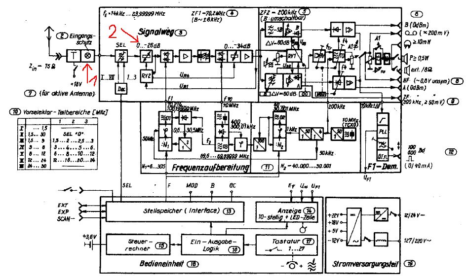 Ach so, um den Draht zum leuchten zu bringen, müßte man schon ziemlich weit hochdrehen. Es gibt tatsächlich 2 Lämpchen. Lampe 1 für den Eingangsschutz und Lampe 2 für das RF-Gain 0 ... -25dB. Durch die Drahtbrücke ist momentan das Dämpfungsglied am Eingang deaktiviert, was die Großsignalfestigkeit beeinträchtigt. Laut obigem Schaltplan fallen am Lämpchen 0,5 bis 17,9 Volt ab. Ich würde mal ein 24V / 100mA Lämpchen probieren. Wichtig ist auch ein niedriger Kaltwiderstand, sonst treten schon bei voller Verstärkung ~2 dB Dämpfung auf. Mfg.