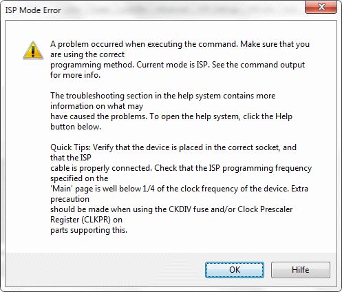 (F)rohe Ostern. Ich habs ebenfalls mit AVR Studio versucht und da bekomm ich ebenfalls eine Fehlermeldung (siehe Anhang). Habe verschiedene ISP Frequenzen verucht - ohne Erfolg. Alles Andere wird erkannt...nur besagter Tiny nicht. Doof nur, dass ich ihn nicht wechseln kann, da fest aufgebraten.