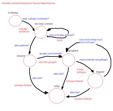 So könnte sowas zb als Graphik aussehen (Bild) Es zeigt den 'Weg' der State-Machine 'Michelle' mit den möglichen Zuständen bei der Lösung des Problems "Wie schreibe ich ein Referat zum Thema 'Visualisierung von State-Machines'". Weitere Verfeinerungen sind natürlich möglich und sollten auch gemacht werden :-)