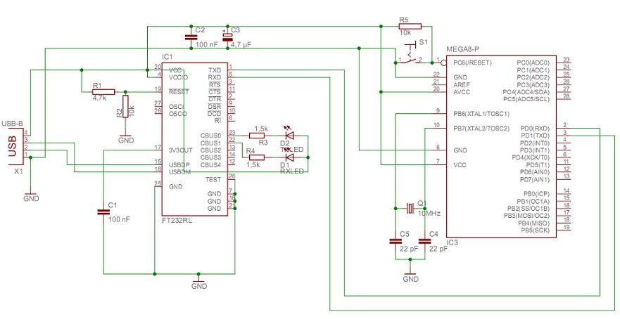 Hallo allerseits, da ich noch ein bisschen grün hinter den Ohren bin im Bereich Mikrocontroller & Co. ;) hab ich mal ne Frage. Ich will eine kleine kleine Steuerung per USB bauen. Diese soll später mal ein LCD oder ähnliches ansteuern. Dafür habe ich selber eine kleine Schaltung entwickelt. Da das meine erste eigene Schaltung ist, wäre es cool wenn jemand mal drüber guckt ob ich irgendwo ein grobes Faul begangen hab oder ähnliches. Ich bin offen für konstruktive Vorschläge und Kritiken. mfg Henry PS: die ISP kommt später mal noch rein ...