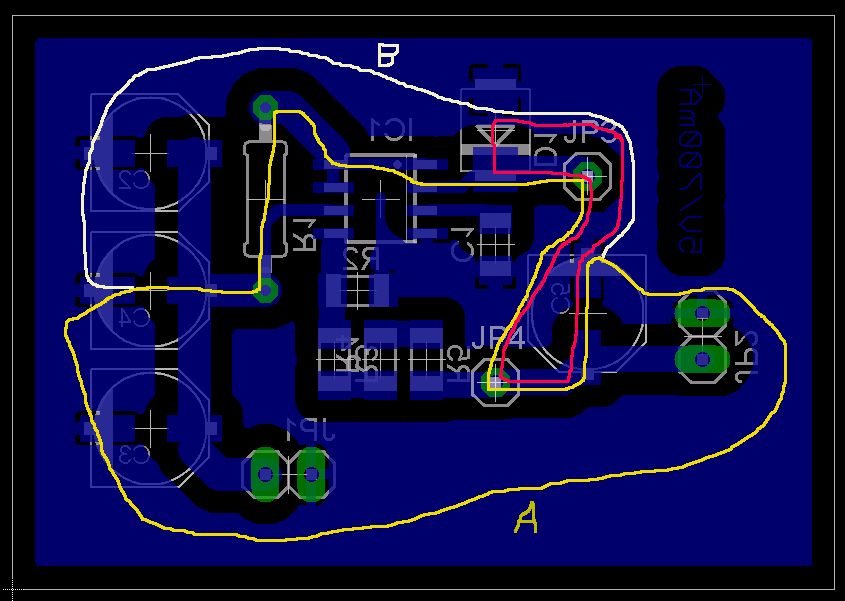 > das Handy hat einfach 5,3 Volt gebraucht... > und mein Schaltregler hat ca. 5,1 erzeugt. Ich tippe mal eher, dein Schaltregler erzeugt soviel Ripple, dass das Handy etwas ins Kotzen gekommen ist. Denn das Layout für die Ladephase der Spule ist extrem suboptimal... Zeichne dir mal in dein Layout die Strompfade für die Freilaufphase (rot, recht kompakt) und die Ladephase (gelb A bzw. weiß B) ein. Die beiden letzeren (eigentlich sollte das nur 1 schön definierter sein) sind unterirdisch :-/ Auch die Anbindung des Feedbackspannungsteilers ist ungeschickt. > das Handy hat einfach 5,3 Volt gebraucht... Du hast vermutlich Störungen auf der Ausgangsspannung und das Handy kommt erst ab einer höheren Mindestspannung damit klar. Auch wenn du ein anderes IC hast, sieh dir als Grundlage mal das an: http://www.lothar-miller.de/s9y/categories/40-Layout-Schaltregler