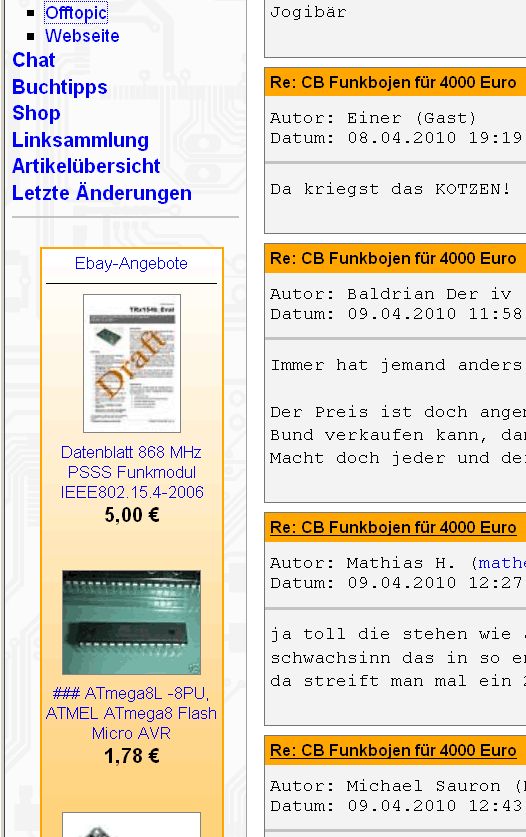 Dom H. schrieb: > Am besten finde ich noch "Lieferzeit: 5 Tage." > So lange brauchen E-Mails heutzutage schon? Er will aber auf Nummer sicher gehen, denn in den Details zur Veranddauer steht: "Der Verkäufer versendet den Artikel innerhalb von 30 Werktagen nach Zahlungseingang." Außerdem: "Der verkaufte Artikel muß vom Käufer vollständig bezahlt sein, bevor er versendet wird." Kann ich nicht nur 1€ bezahlen und die ersten 2 Seiten vom Datenblatt bekommen? Die Datenblätter scheinen sich ja gut zu verkaufen. Hoffentlich hat er bei der PDF Druckerei genug Exemplare in Auftrag gegeben... PS: Wie sieht es mit dem 14-tägigen Rückgaberecht aus? Muss ich dann die kosten vom Rückversand tragen? Muss ich Ersatz leisten wenn das PDF zerknittert, Fettflecke hat, vom Hund gefressen wird oder sich einzelne Bits beim lesen abnutzen?
