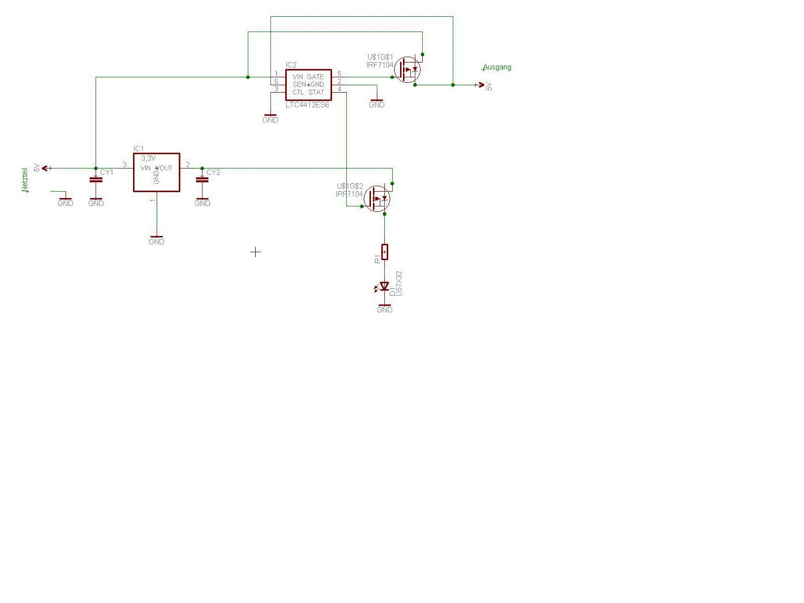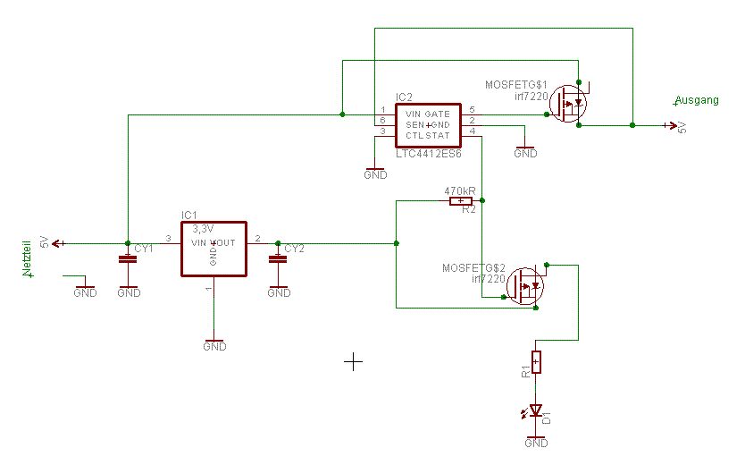 Also da bin ich froh, dass der Mosfet für den LTC4412 passt, denn die Platinen sind auch schon fertig. Ja, die Gatespannung habe ich gemessen. Also mit dem Multimeter an GND und am Stat Pin. Da kommen eben die 3V raus. Im Endeffekt besteht die Schaltung ja zweimal parallel, für eine Akkuweiche. Da die zwei ja komplett ident sind, habe ich nur einen Zweig gezeichnet. Figure5 im Datenblatt. Falk, im Endeffekt geht es mir darum zu wissen, welcher von den zweien LTC4412 in der Akkuweiche gerade den Strom liefert. Ich dachte mir eben, ich verwende einen 3,3V Spannungsregler und versuche mit dem Stat Pin eine Led zum leuchten zu bringen. Aber das ist wohl schwieriger als gedacht. Fällt dir eine Lösung ein? Zur Not muss ich einen Attiny13 nehmen, der das Signal als Low oder High erkennt und dann die Led ansteuert, aber das wollte ich umgehen... LG Peter
