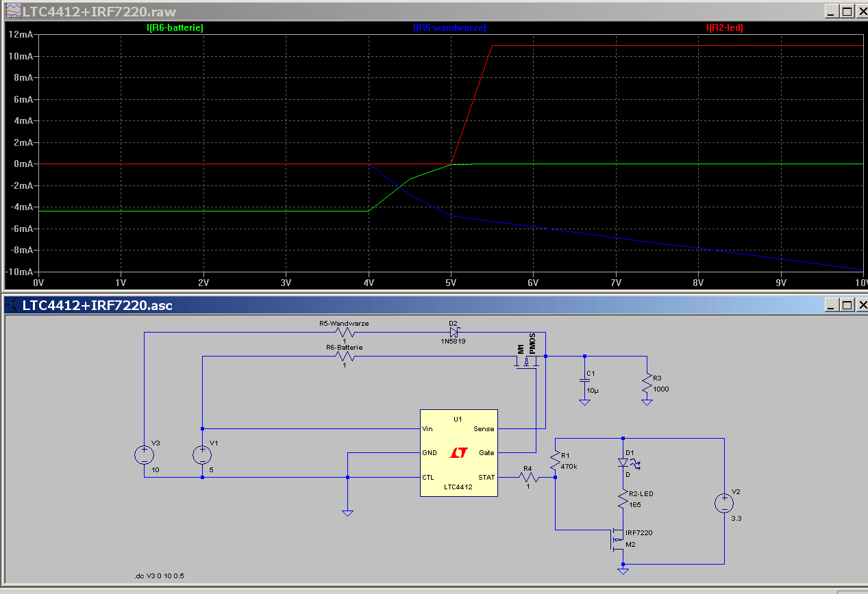 Hallo Alexander, Danke für deine Antwort. mein Schaltplan ist genau so wie im Datenblatt. Der Stat-Pin geht bei mir dann direkt auf den Gate vom Mosfet. Drain ist auf 3,3V vom Regler und Source geht an + (Über Widerstand) von der Led. Der LTC4412 schaltet auch schön brav von 0,2V auf 3V hin und her, so wie es sein soll. Nur der IRF7220 schaltet immer durch...Die Led leuchtet immer. Lg Peter