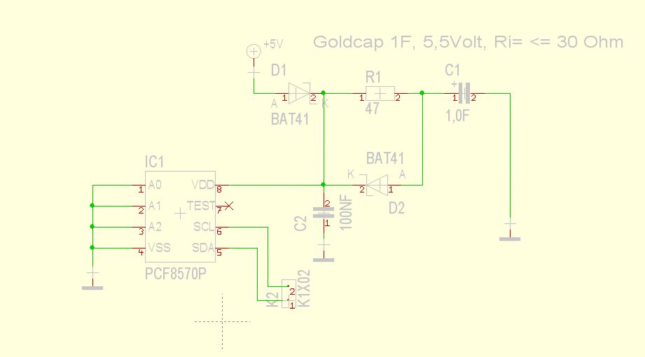 Hallo, ich möchte ein PCF8570 SRAM bei Spannungsausfall mit einem 1F (5,5Volt, Ri = max. 30 Ohm) GoldCap versorgen. Siehe Schaltbild. Funktioniert das so ? Danke, 10Mhz
