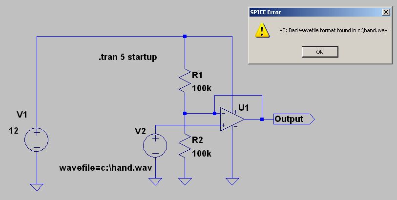 Im Anhang ist eine LTSpice Simulation und eine WAV-Datei. Die Simulation produziert eine Fehlermeldung (siehe HAND.GIF). Die HAND.WAV habe ich mit dem Windowsprogramm Audiorecorder erstellt. Kann mir jemand sagen, wo genau der Fehler liegt? In der Spice-Anweisung oder in HAND.GIF?