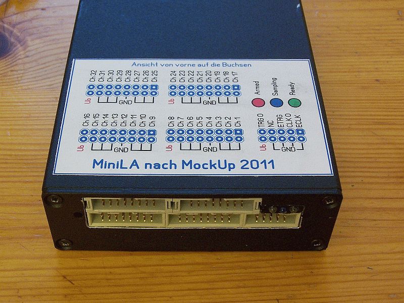 Ich hol den Thread mal wieder hoch ;-) Ich hatte einige Fragen zum "komischen Etikett" oben drauf. Also: das ist einfach ein Stück Papier, mit einem Farbdrucker (Tinte) bedruckt und mit einem handeslüblichem PrittStift aufgeklebt. Das Zeugs hält wie Bombe und wenn es irgendwann mal vergrapscht ist, kommt halt ein neues drauf. Prittstift kann man prima mit warmen Wasser wieder ablösen. Hier als Anlage mal die PDF. Achtung! beim Ausdruck auf "keine" Skalierung stellen (also 100%) Doch Fragen habe ich auch wieder (meine Beschäftigung mit meinem alten LA basierte noch auf einer sehr einfachen DOS-Software mit Parallelport, ist Jahre her und teilweise erfolgreich vergessen): 1. Was sagen mir die 3 LEDs? Ok, Ready ist klar.... Irgendwie sind die doppelt belegt oder? 2. Wenn ich auf einen Kanal triggere, leuchten (scheinbar) alle LEDs beim Einlesen, danach habe ich den Triggerstrich im Anzeigefenster. Soweit klar. 3. Wenn ich auf Extern triggere und natürlich ETRG verdrahtet habe, leuchtet nur die Rote LED (Links), das irritiert mich. Ich sehe dann auch keinen roten Triggerstrich in der im Anzeigefenster. 4. Im Triggerauswahlfenster kann ich nur die ersten 16 Kanäle und Extern auswählen, ist das so gewollt? Klar, ich kann das mit Extern umgehen und auch die Kanalzuordnung anpassen. Es würde natürlich helfen, mal fix auf Kanal 32 zu triggern wenn es die Schaltung erfordert. So muss man erst umstecken. 5. Ein paar Begriffe in der Software sagen mir noch nichts, gibt es irgendwo gute Literatur zu den Feinheiten von Logicanalyzern? (in Deutsch) 6. An CLKO soll ja ein (der?) interne Takt anliegen, bei mir kommt da nix raus. Old-Papa