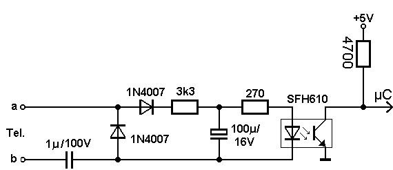 http://www.elektronik-kompendium.de/forum/upload/20060604203037.jpg Die Schaltung verstehe ich noch viel weniger: Bei 60 V Rufspannung, also 85 V hinter dem Gleichrichter müsste der Optokoppler doch sofort abrauchen (Maximale Sperrspannung von LEDs sind doch nur so etwa 5 V)!?