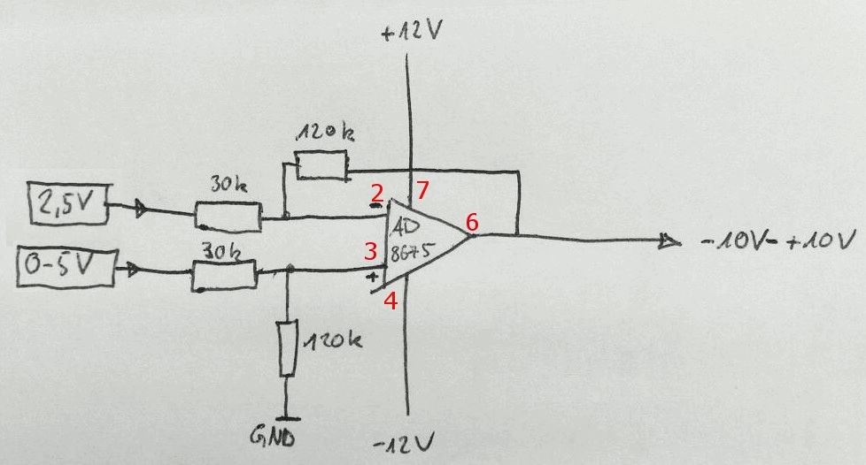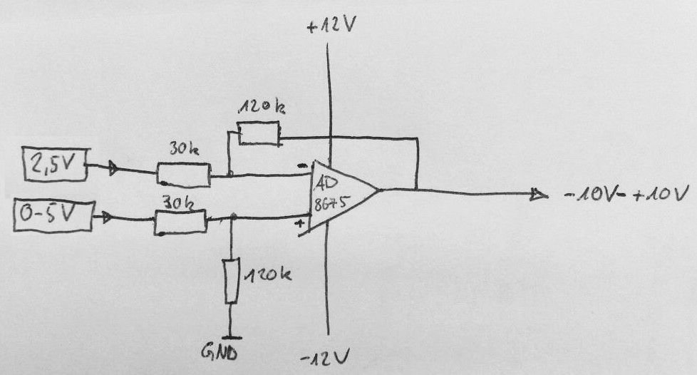 oder du fühst ein DAC-Ausgang direkt an den positiven OP-Eingang, einmal 120k vom ausgang des OP zum negativen Eingang, und die 30k vom negativen Eingang zu den 2,5V. dann bekommst du: 0V -> -10V 5V -> 10V