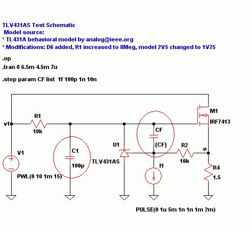Suche "TL431 compensation" nach einer für dich guten Erklärung http://powerelectronics.com/mag/Kollman%20and%20Betten%20September%202003.pdf http://www.edn.com/contents/images/6255051.pdf http://www.powersystemsdesign.com/design_tips_june07.pdf Du siehst dort Kondensatoren zwischen ADJ und A am TL431 und Phasendiagramme. Deine Schaltung hat dasselbe Problem weil der MOSFET mit seiner Gate-Kapazitt (und dem extrem ungeschickten C10, entfern den) noch bremst. Also muss der TLV431 langeamer gemacht werden. Aber das macht man nicht, im dem man ihm noch mehr Gewicht ans Bein bindet, sondern indem man seinen Ausgang auf seinen Eingang rückwirken lässt, "ach, so schnell kommt die Reaktion".
