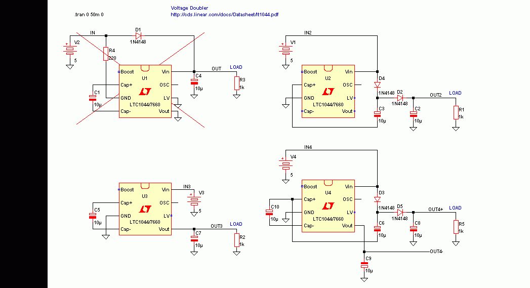 Ich kenn' LTspice nicht aber gibts da eine Startbedingung damit der interne Oszillator des LTC1044 los läuft? In realer Hardware funktioniert der Doubler. Wenn man simulieren will braucht man immer auch Kenntnisse und Erfahrung vom Simulationsprogramen.