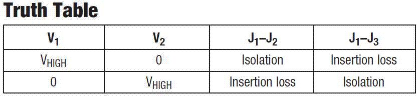 Wenn V1=High und V2=0 ist, dann ist J1 mit J3 verbunden und J2 ist "offen". Ist dagegen V1=0 und V2=High, dann ist J1 mit J2 verbunden und J3 ist "offen". Der Ausdruck "Insertion loss" bezeichnet die Einfügungsdämpfung des geschlossenen Schaltweges, also bildlich gesprochen den "Längswiderstand" des Schalters.
